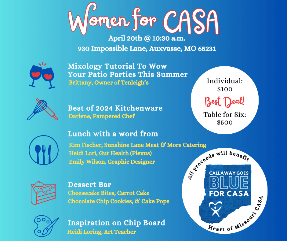 *All proceeds will benefit Heart of Missouri CASA's "Callaway Goes Blue" campaign to raise awareness and support for the nearly 200 Callaway children who are in foster care each year.